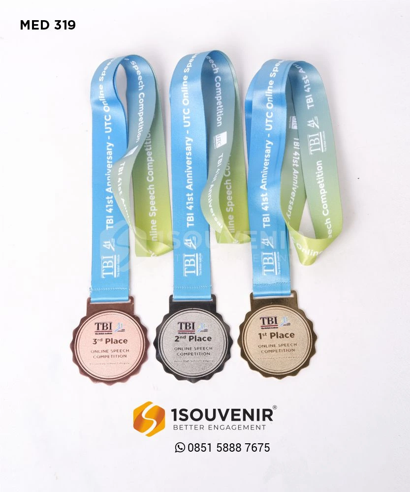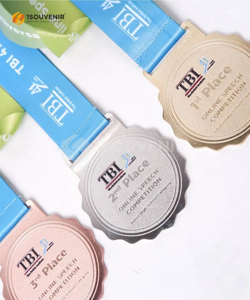 Medali Online Speech Competition TBI hadir dengan desain elegan dan detail yang rapi, tersedia dalam tiga varian warna: emas, perak, dan perunggu. Dilengkapi tali leher bermotif khusus sesuai tema acara, medali ini menjadi simbol penghargaan atas dedikasi dan pencapaian para peserta.