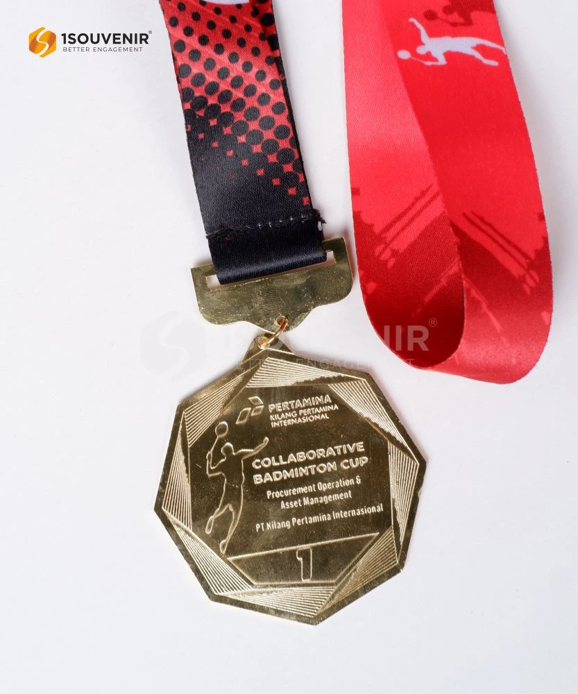 Medali Collaborative Badminton Cup dirancang menggunakan material logam berkualitas tinggi dengan bentuk segi delapan yang unik. Detail grafir yang rapi dipadukan dengan tali bermotif dinamis, menjadikan medali ini sebagai simbol penghargaan atas semangat juang dan kolaborasi para peserta.