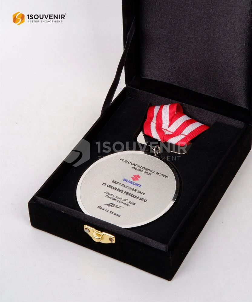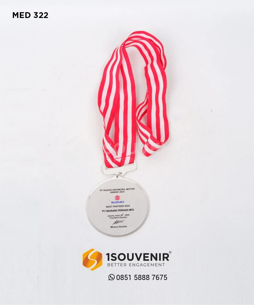 Medali PT Suzuki Indomobil Motor Award dirancang menggunakan bahan logam premium dengan tampilan minimalis yang tetap elegan. Dipadukan dengan tali merah putih bermotif garis, medali ini melambangkan kehormatan atas pencapaian gemilang di industri otomotif.