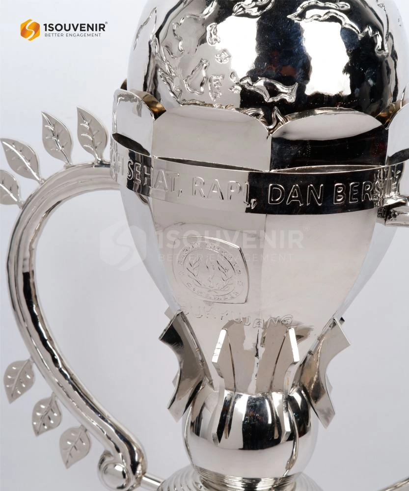 | Teknik | piala logam tatah krom nikel, kuningan etsa cat krom emas |