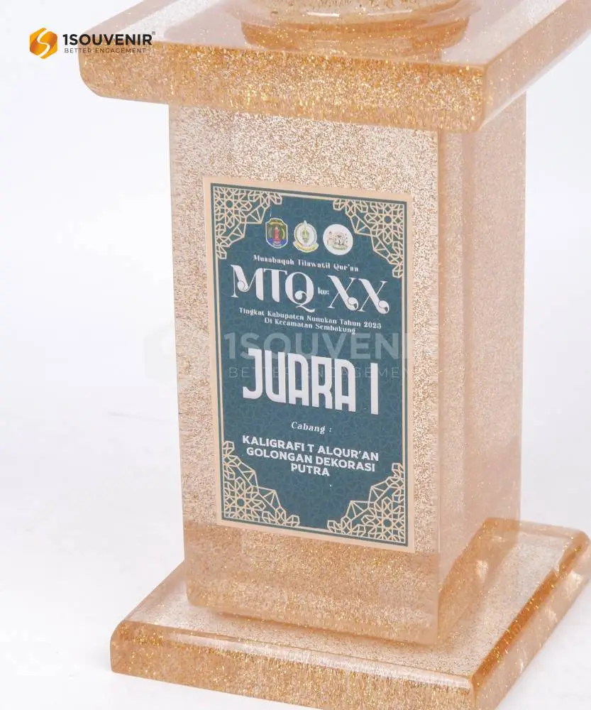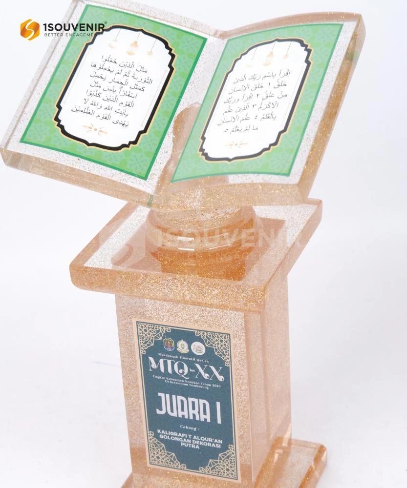 Piala MTQ XX Kaligrafi Al-Qur’an ini dirancang secara eksklusif dengan konsep mushaf terbuka yang berdiri di atas pedestal kokoh berlapis glitter emas. Setiap detailnya mencerminkan kemuliaan tema, menjadikannya simbol prestasi yang membanggakan dan inspiratif.