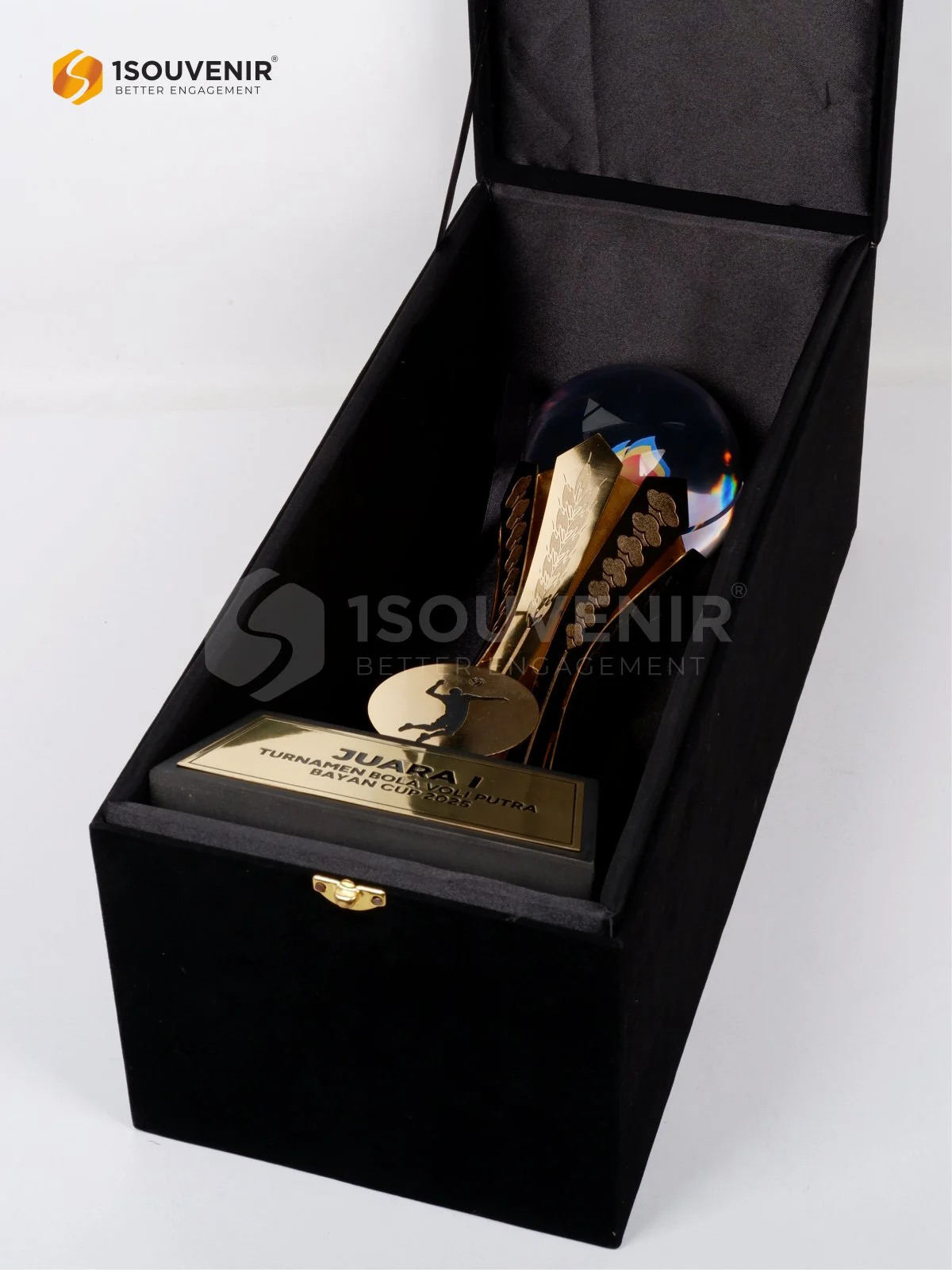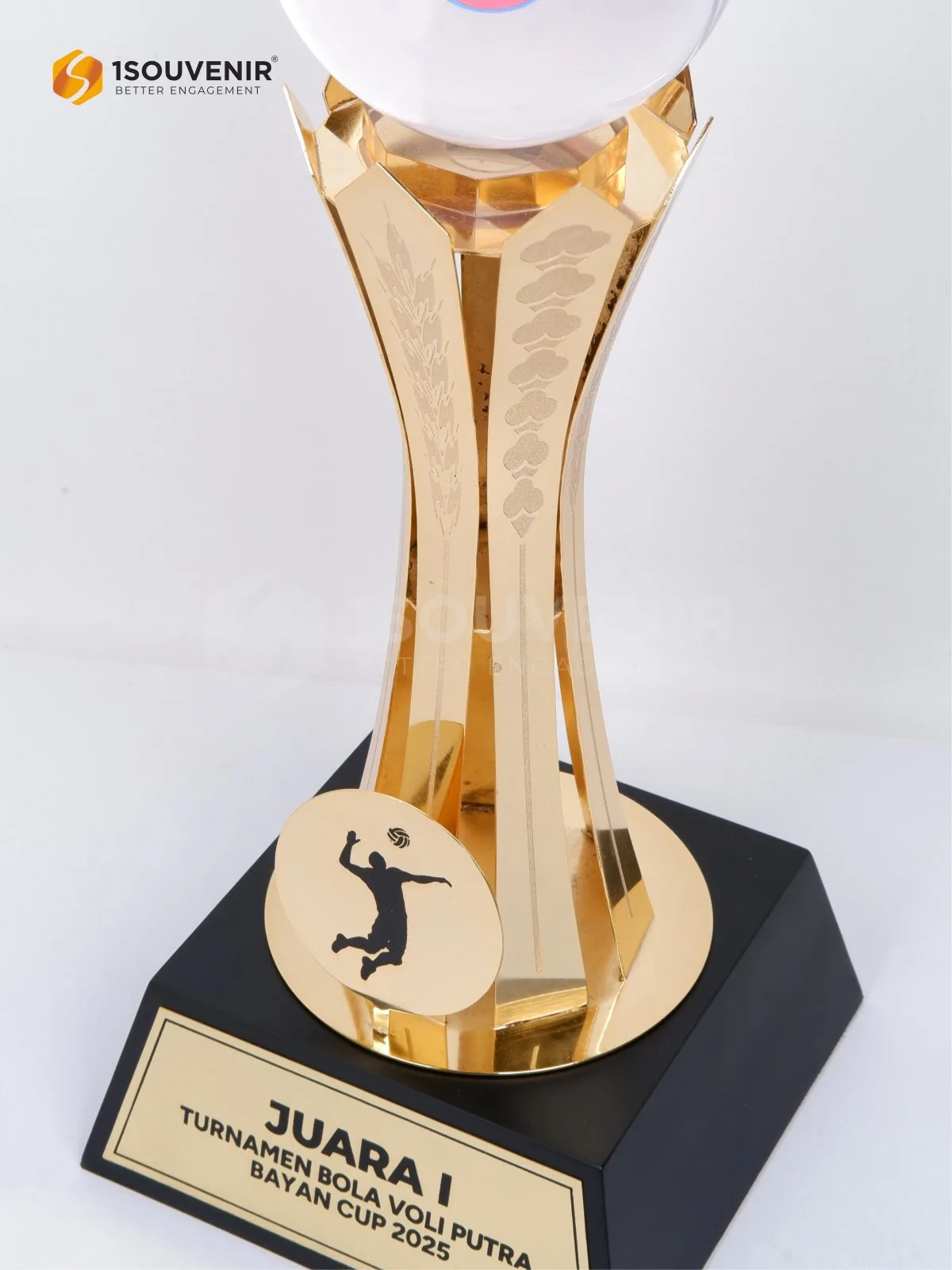 Piala Bayan Cup 2025 dirancang khusus dengan elemen representatif terkait turnamen voli sehingga menjadi hadiah yang berkesan. Piala olahraga ini tampak elegan juga dengan aksen warna emas yang membalutnya.