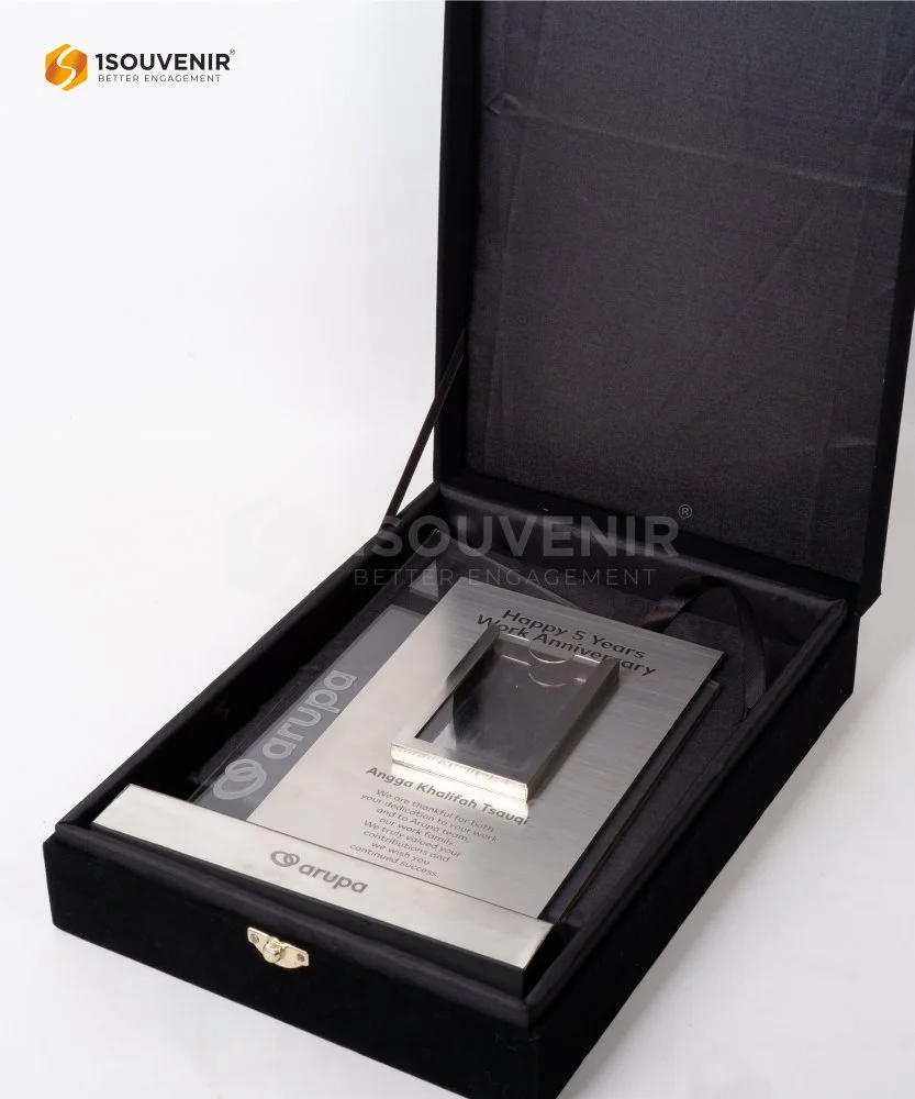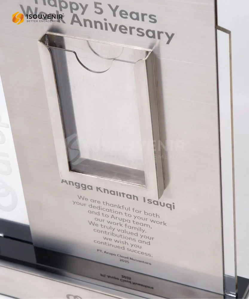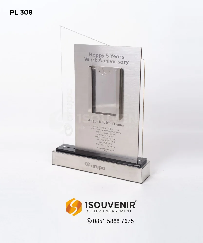Plakat PT Arupa ini dirancang khusus untuk momen Happy 5 Years Work Anniversary dengan menggunakan material logam berkualitas yang dipadukan dengan akrilik. Mengusung desain modern dan elegan, plakat ini merepresentasikan profesionalisme sekaligus bentuk penghargaan mendalam kepada karyawan berprestasi.